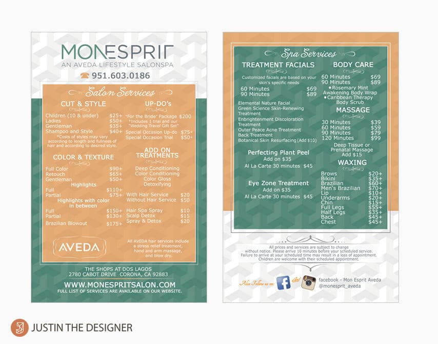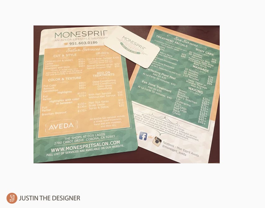 graphic design, hair salon graphics, hair salon menu, hair salon pricing card, menu design, monesprit salon